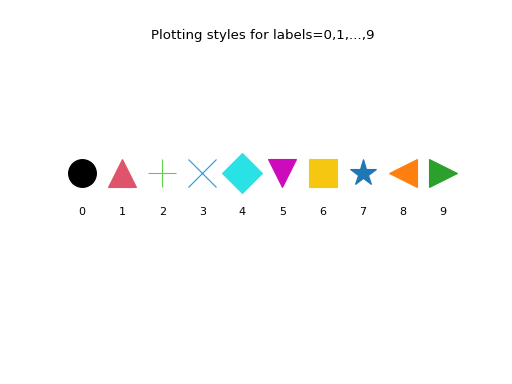 >>> ncol = len(deadwood.colors) >>> nmrk = len(deadwood.markers) >>> mrk_recycled = np.tile( ... deadwood.markers, ... int(np.ceil(ncol/nmrk)))[:ncol] >>> for i in range(10): ... plt.text( ... i, 0, i, horizontalalignment="center") ... plt.plot( ... i, 1, marker=mrk_recycled[i], ... color=deadwood.colors[i], ... markersize=25) >>> plt.title("Plotting styles for labels=0,1,...,9") >>> plt.ylim(-3,4) >>> plt.axis("off") >>> plt.show()