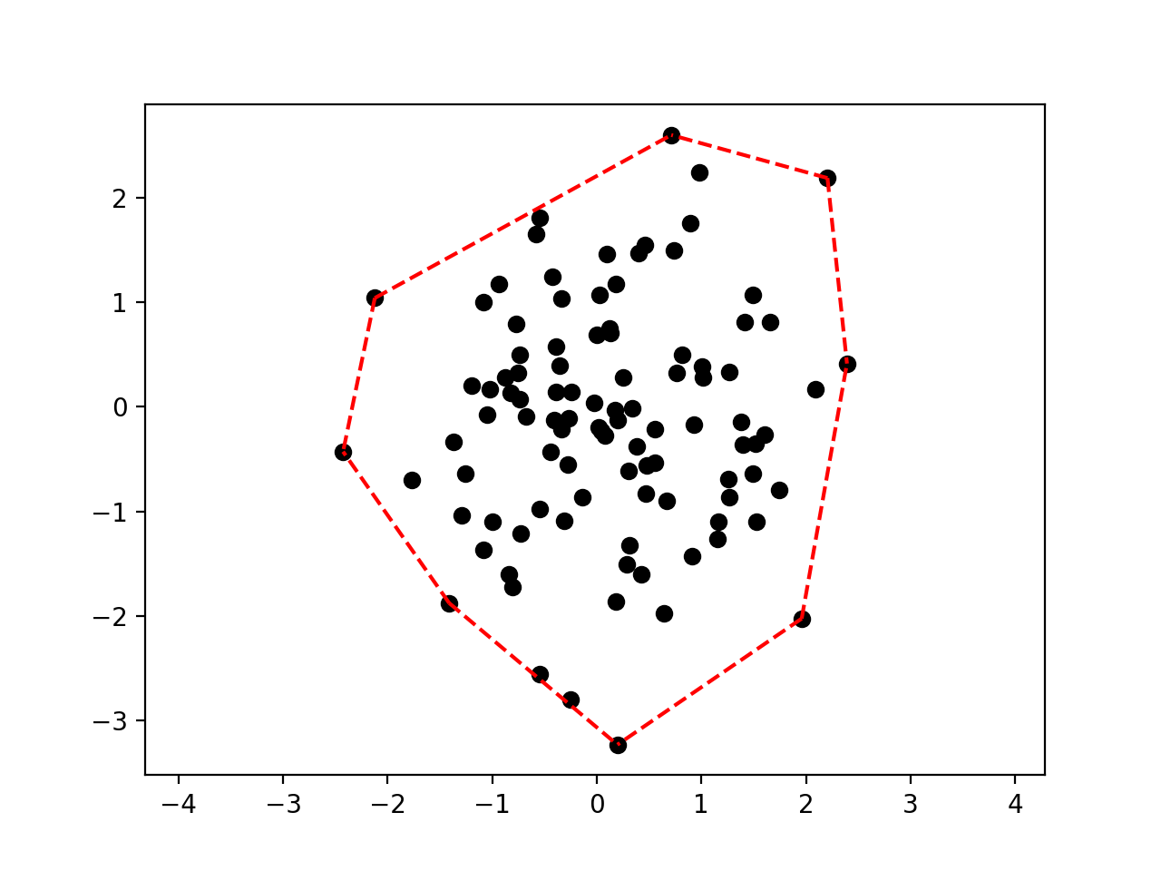 >>> import scipy.spatial >>> X = np.random.randn(100, 2) >>> hull = scipy.spatial.ConvexHull(X) >>> deadwood.plot_scatter(X) >>> deadwood.plot_segments(hull.simplices, X, style="r--") >>> plt.axis("equal") >>> plt.show()